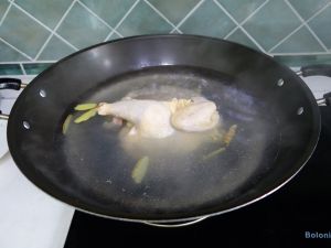 水烧沸腾,丢几片姜,放鸡下去大火煮。