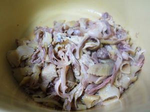 然后再手撕,形状随自己喜好,可大块一些,也可成细的鸡丝。话说这个过程很过瘾哒,释放压力。【调皮】