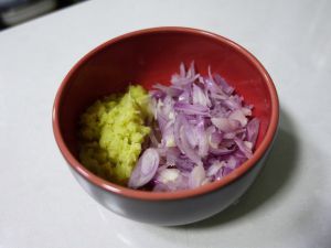 红葱头拍破后切碎,与磨好的姜茸放在同一个小碗里。
