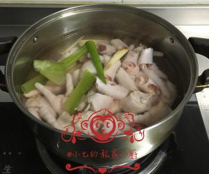 锅置于火上,凉水放入凤爪,水葱,姜,花椒,料酒去除腥味!煮十五分钟左右,慢火避免凤爪煮裂!