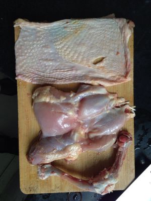 大鸡腿分离骨、肉、皮。 将肉切一厘米左右的肉丁