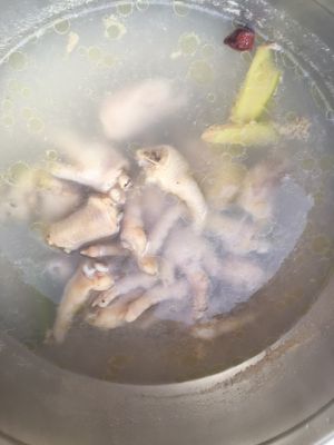 凉水起锅,放入鸡爪,葱和姜片,开锅后放入少许料酒,煮滚大概15-20分钟离火。