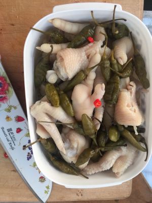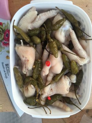 用凉水冲凉冲透后,放入干净器皿里,放入糟卤,泡椒水和泡椒,最好糟卤没过鸡爪,然后放入冰箱搁置2-4小时后食用,我这里是泡了overnight.