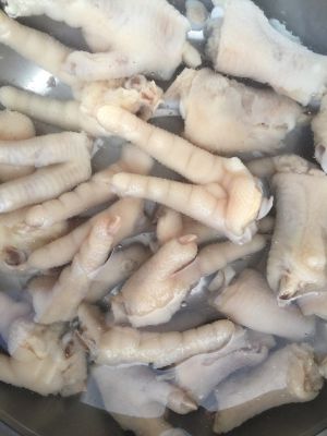 鸡爪最好买新鲜的,把指甲剪掉,洗干净放锅里煮,放一点点盐,料酒,老姜,烧开后5分钟可以关火,(提前备好一盆凉开水)把鸡爪放入凉开水,凉后把鸡爪切开