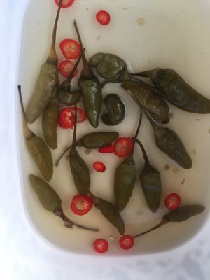 把小米椒剪一刀,别剪断哦!倒入大碗里,加1勺白醋后把鸡爪倒入拌匀.