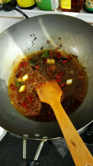 热油,放去辣椒,葱姜蒜,花椒炒,再加入辣酱,炒出香味,再加入适量水,煮开