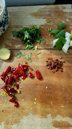 准备调料,辣椒切小段,葱花,香菜,姜蒜,切好,备用