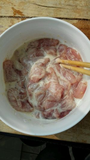 肉切片加生抽胡椒粉细盐一只蛋清及小量淀粉搅匀腌渍。
