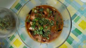 水再度烧开,把肉放入变色即可连汤倒入碗内,加上辣椒蒜末和香葱。