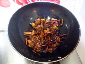 然后放油在锅里冷油放花椒,然后放入干辣椒,把鸡丁放进去炒,吃的干的可以多炒一会了再放配料
