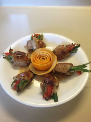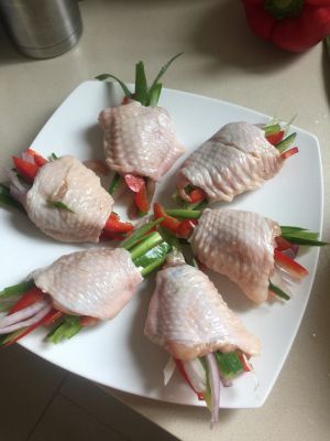把辅料一条条装入空心鸡翅中,辅料可跟据自己的喜欢而配