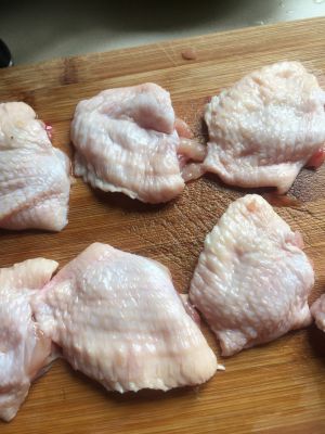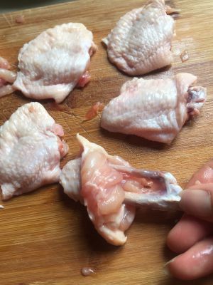 左手掌握住鸡翅下端,右手从切断筋膜中用大拇指往下一推,推到下端时左手把鸡肉往下一拉,一拧或用刀一切就掉了,然后把鸡肉翻过来
