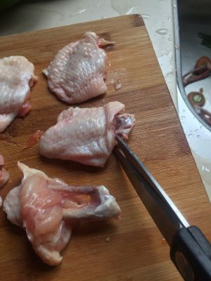 鸡翅洗净用剪刀或刀子切断鸡筋骨