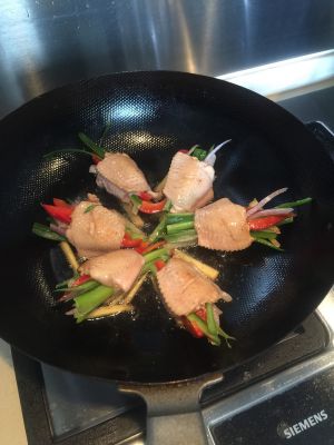 放入生抽,葱花加入两勺老干妈中火翻炒,2勺糖收汁