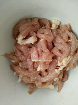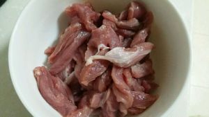里脊切丝,搁点生抽,淀粉抓匀,腌制几分钟,期间准备别的东西