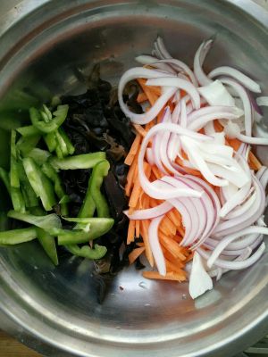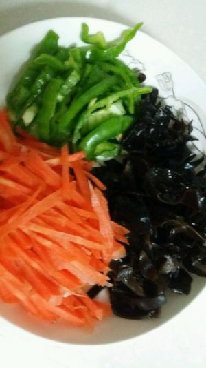 木耳,青椒,胡萝卜,洋葱切丝,如图