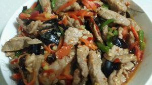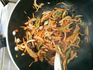 把肉丝放入油里鞭一下,熟了以后放入平常小汤勺一勺左右豆瓣酱,然后继续鞭,鞭到红色放入切好的茄子胡萝卜青椒,鞭几下放一点黄酒,一勺糖,两勺左右美味鲜酱油。加一点水,炒熟即可。