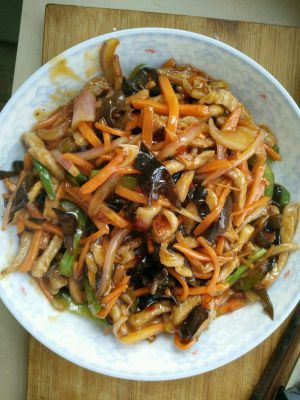 放油把胡萝卜,木耳炒几下放刚炒好的肉丝