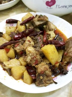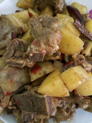 然后烧油把调料一块放入,在放排骨炒黄,在放上土豆炒一会,这个时候放点白糖和老抽提色,再加适量的水!煮一会,直到汁基本收了就可以了!