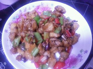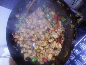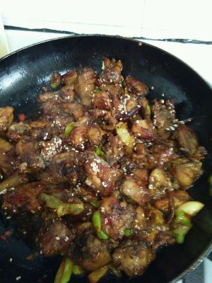调好口后加入炸好的鸡丁翻炒,炒至鸡丁入味即可(根据口味加入芝麻)