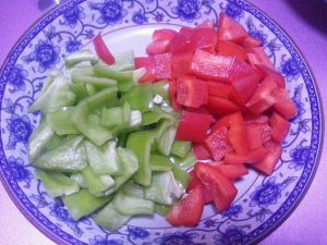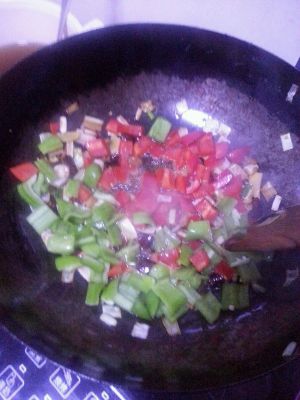 再加入青椒和红椒丁翻炒,加入盐,味,糖调口