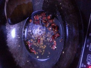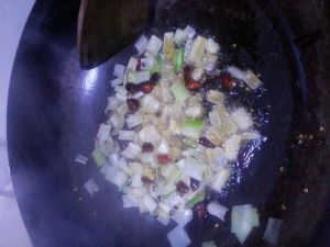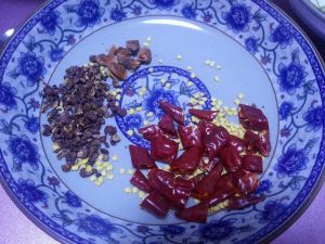 4、用少许油、待油温为完全热时炒香葱姜蒜,倒入辣椒和花椒爆香