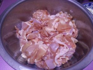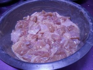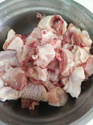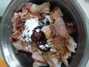 鸡腿买时让店家帮忙切成小块,加适量盐、料酒、黑胡椒粉、少量淀粉腌制30分钟