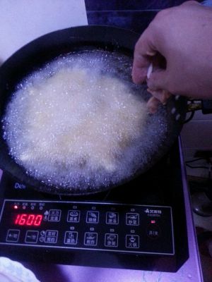3、将腌好的鸡块入锅油炸至焦黄出锅