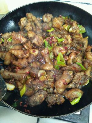 倒入鸡块,继续翻炒入味加鸡精或少许味精翻炒出锅。
