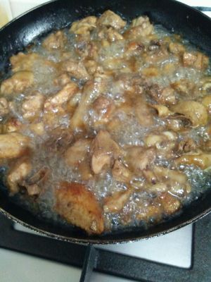 锅放油,8成热放入腌制好的鸡腿,炸至外表变干成深黄色后捞起沥油待用(鸡皮炸后容易粘锅,这过程要不断翻炒)