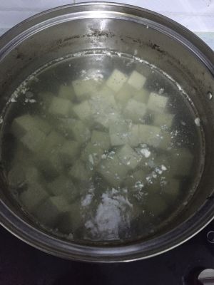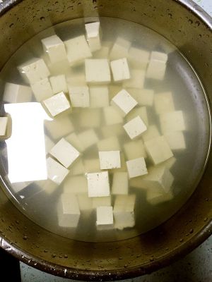 豆腐切5厘米大小正方形块,热水加盐烫一下