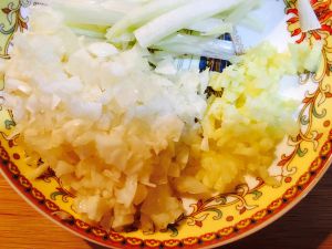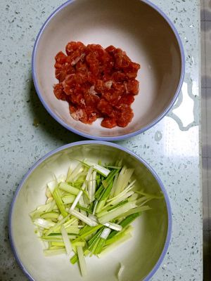 牛肉切碎粒,蒜苗从中间劈开切小段备用