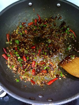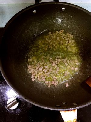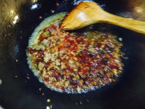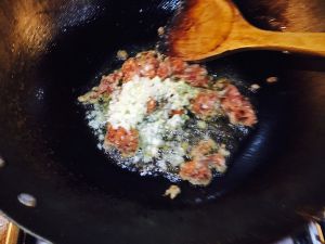 锅内放油适量偏少,煸肉碎,葱姜蒜,红油豆瓣,豆豉,放料酒。