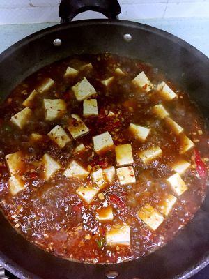 肉末炒熟后放入豆腐丁,稍微翻炒下即可。豆瓣酱很咸,所以不用额外放盐了。