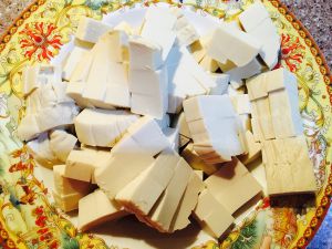 南豆腐用小水冲洗一下,切成1.5×1.5厘米的小块,大小可以自己调整,适中就可以!