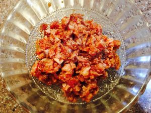准备麻婆豆腐料:干辣椒面,大蒜切成蒜末(剥蒜皮的有个速成法,大蒜最外一层皮去掉,冲一下水,菜刀拍扁大蒜,去掉蒜皮,根部杂质,然后直接剁碎就可以了!)八角,花椒。