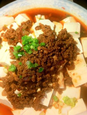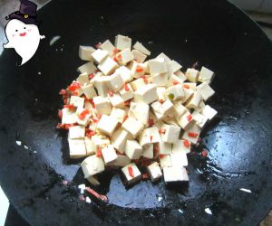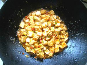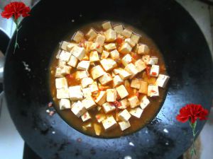 炒锅放油适量,加入花椒炒香,再加入郫县豆瓣,加入葱姜沫,最后放入豆腐翻炒,让每块豆腐都裹上豆瓣酱,翻炒均匀后加入适量水,炖一小会儿,加入鸡精,撒入葱花既可。。。