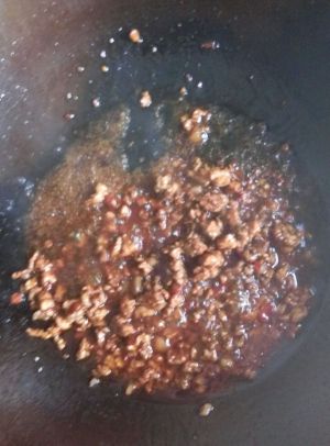 下入肉末同炒,下少许料酒。因为我下的肉比较肥,所以延长爆香时间逼出肥肉的油。