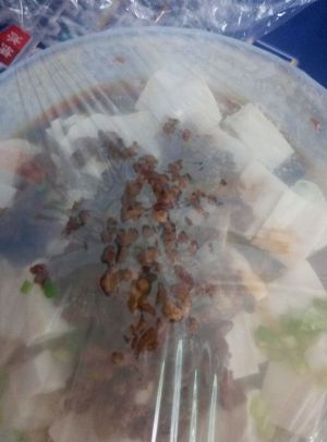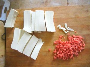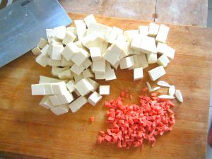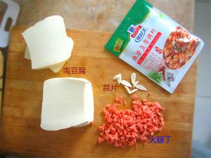 南豆腐清水冲洗后切厚约1.5cm的片,大蒜两瓣儿切片氧化,火腿切细小丁,备用~