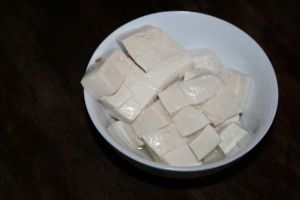 嫩豆腐切成1.5cm的小方块,在加了盐的沸水中烫一下去除豆腥;