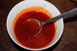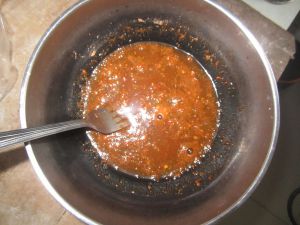 准备麻辣汁:郫县豆瓣酱、酱油、料酒、糖、花椒油、蘑菇精加上半碗清水,搅拌均匀(哈哈,闻到麻辣的香味啦);
