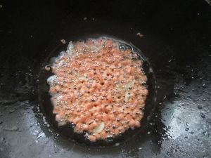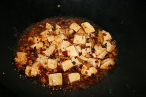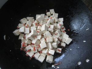 倒入肉末翻炒变色。然后加入郫县豆瓣酱,和豆豉。翻炒出香味后加入豆腐。
