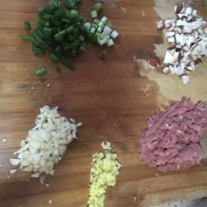 牛肉洗净剁碎成末,加入少许干淀粉抓匀,再加入少许料酒、芝麻油、生抽、胡椒粉拌匀腌制15分钟;