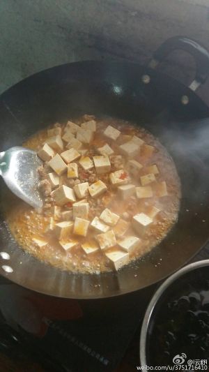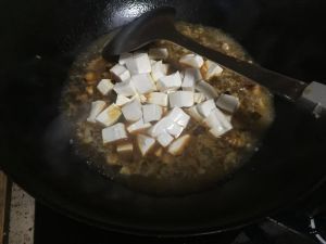 然后加点烧开的热水,尽量不要翻炒。豆腐不容易碎