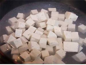 把豆腐切成两厘米左右的小块,放入有盐水的锅中煮一下,盛出待用