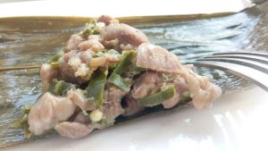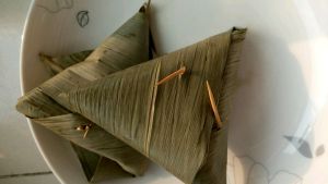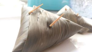 苇叶包好并用牙签固定,上蒸笼进行蒸熟