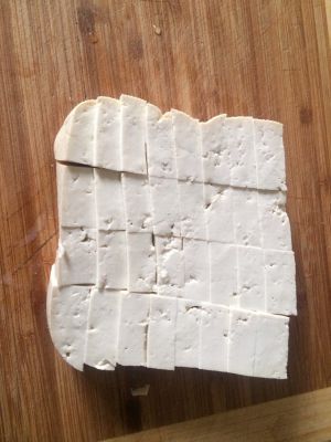 准备一锅水,水开后将豆腐块倒进去焯一分钟左右,用笊篱捞出控水。特别是嫩豆腐,这一步捞出后就直接把豆腐块放在笊篱莉一会儿等下锅就行了。以免豆腐来回倒腾弄碎了