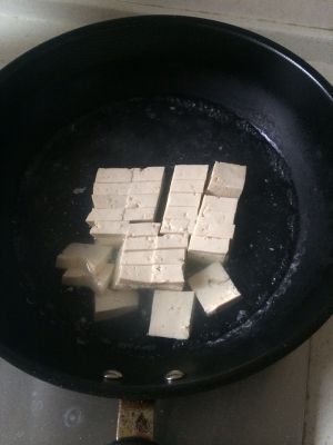 热锅冷油,放蒜泥,小葱沫,爆一下。 豆腐捞出,放进锅里,加热水煮。注意:豆腐用开水过了之后下锅不容易散。