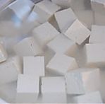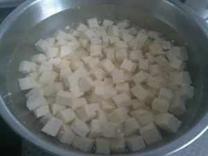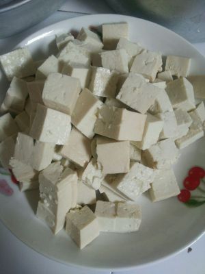 把豆腐切成1.5厘米的小块。开水烫一下捞出过凉待用。这样可以防止豆腐变碎。