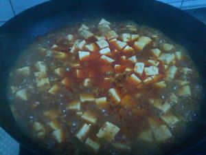 锅内放油,煸香葱姜蒜末,加入一茶匙郫县豆瓣酱,炒出红油,加入肉末炒至变色后,加入开水,豆腐,炖五分钟入味,由于郫县豆瓣已经很咸了,所以我没有放盐,出锅前加入一点鸡精和水淀粉就好了。装盘时撒少许葱花和花椒粉。